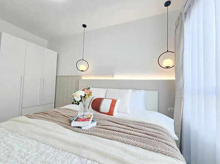 - 1 ห้องนอน ห้องนอนเป็นประตูปิด (ไม่ใช่บานเลื่อน), 1 ห้องนั่งเล่น, 1 ห้องน้ำ